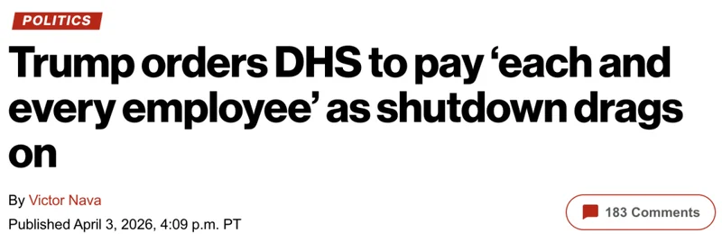 4月3日,特朗普在名为《解放国土安全部脱离民主党引发的关门》的备忘录中发布命令,指示国土安全部长马克韦恩·穆林支付“每一位受民主党主导的国土安全部关门”影响的员工。