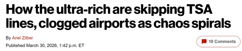 当大多数旅客被困在漫长队伍里时,另一部分人已经开始换一种方式出行。纽约邮报报道称,随着商业机场安检拥堵加剧,富裕旅客正越来越多地转向私人飞机,以避开混乱的机场流程。