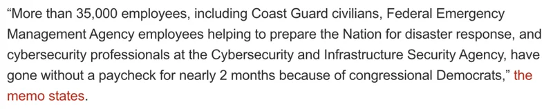 特朗普在备忘录中指出,这种局面已构成影响国家安全的“紧急情况”:“包括海岸警卫队文职人员、协助准备国家灾难响应的联邦紧急事务管理署员工,以及网络安全和基础设施安全局的网络安全专业人员在内的超过 35,000 名员工,因国会民主党人而近两个月未领工资。”