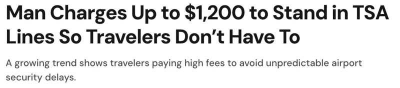 除了私人飞机,围绕“缩短等待”的其他服务也开始冒头。在TSA混乱持续之际,一些“代排队”服务应运而生,有人愿意花高价请别人提前在安检口排队,占位费用甚至高达 1200 美元。