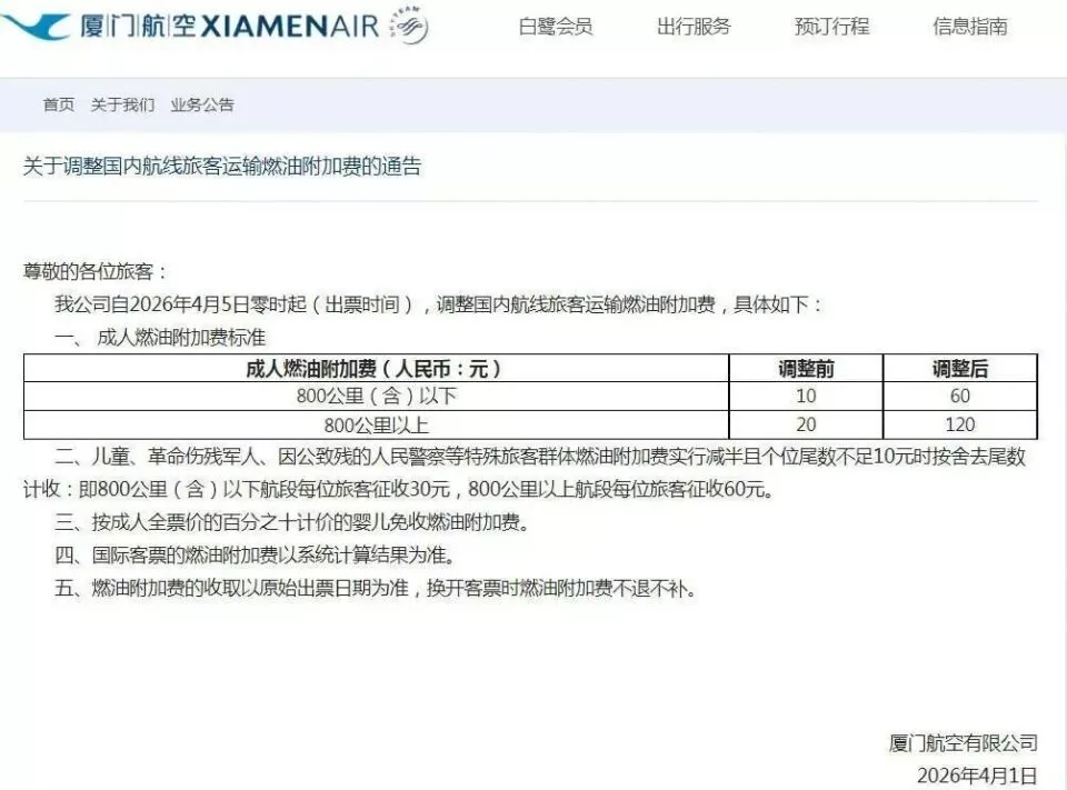 4月1日,国航、南航、厦航、中联航等多家航司发布公告,调整国内航线旅客运输燃油附加费收取标准。自2026年4月5日(含)起销售的客票: