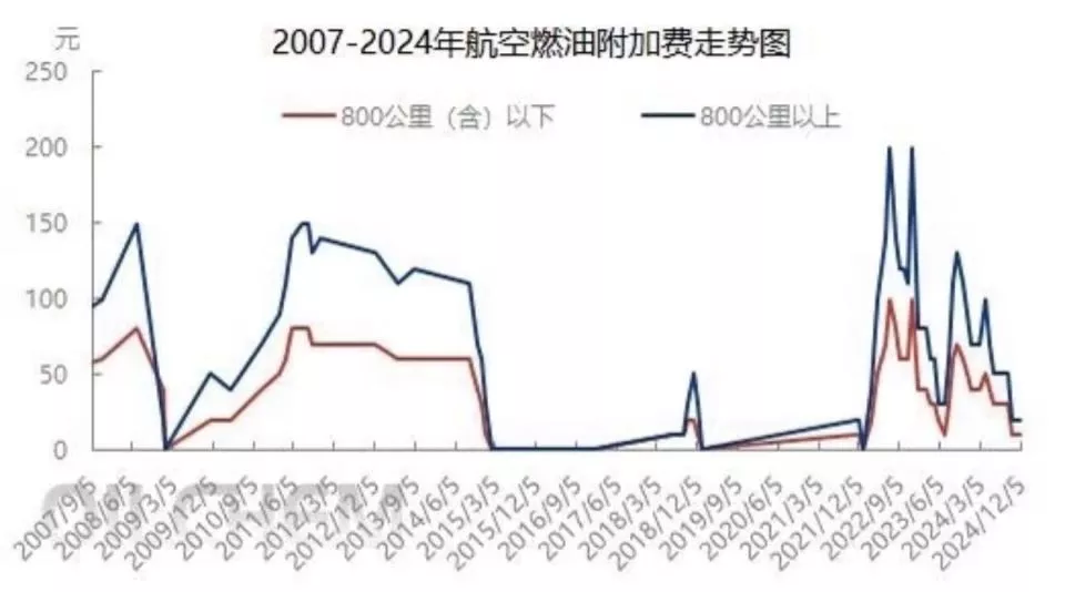 那时候国内航司燃油费收取标准曾一度达到800公里以下100元、以上200元。