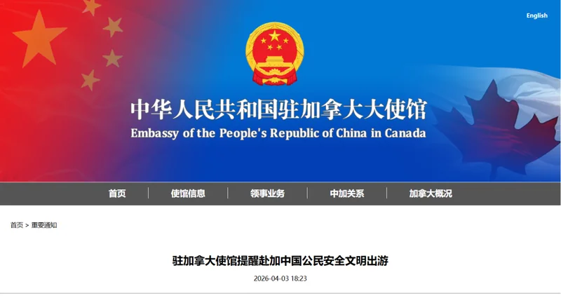 中国驻加拿大大使馆发布通知,提醒赴加中国公民安全文明出游。全文如下: