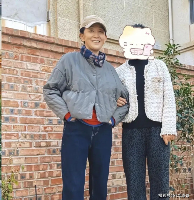 一旁的陈瑾则头戴卡其色鸭舌帽,内搭红色毛衣,外披薄外套,脖子上系着丝巾点缀,下搭牛仔裤与高跟鞋,170cm的身高在人群中十分显眼,即便年过花甲,皮肤依旧紧致、身材苗条,举手投足间满是优雅气质。