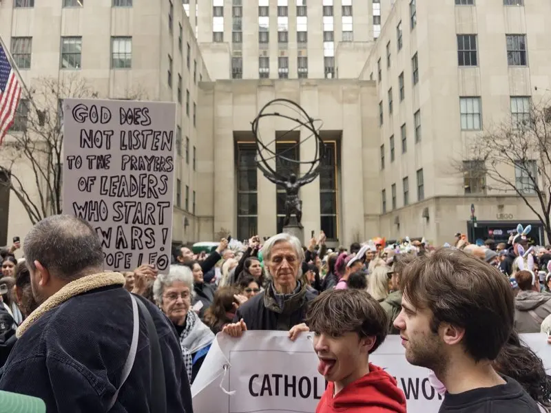 纽约街头从来不缺政治表达,而在美伊战争持续延烧的当下,彩帽游行也成了呼吁反战、和平的阵地。天主教徒拉起横幅,举起标语,引用罗马天主教宗良14世(Pope Leo XIV)的宣言指,发起战争的领导者「双手沾满鲜血」,「上帝绝不会听取这些人的祷告」。也有市民将头饰设计成有和平鸽停留的地球仪,「(和平)是我们现在最需要的」。
