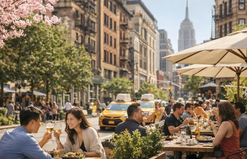 不少纽约人会把这种场景与疫情期间的“户外就餐位”(Shed)联系起来。虽然如今的设置更规范、更整洁,但那种在阳光下吃饭、与城市近距离接触的感觉,依然熟悉。