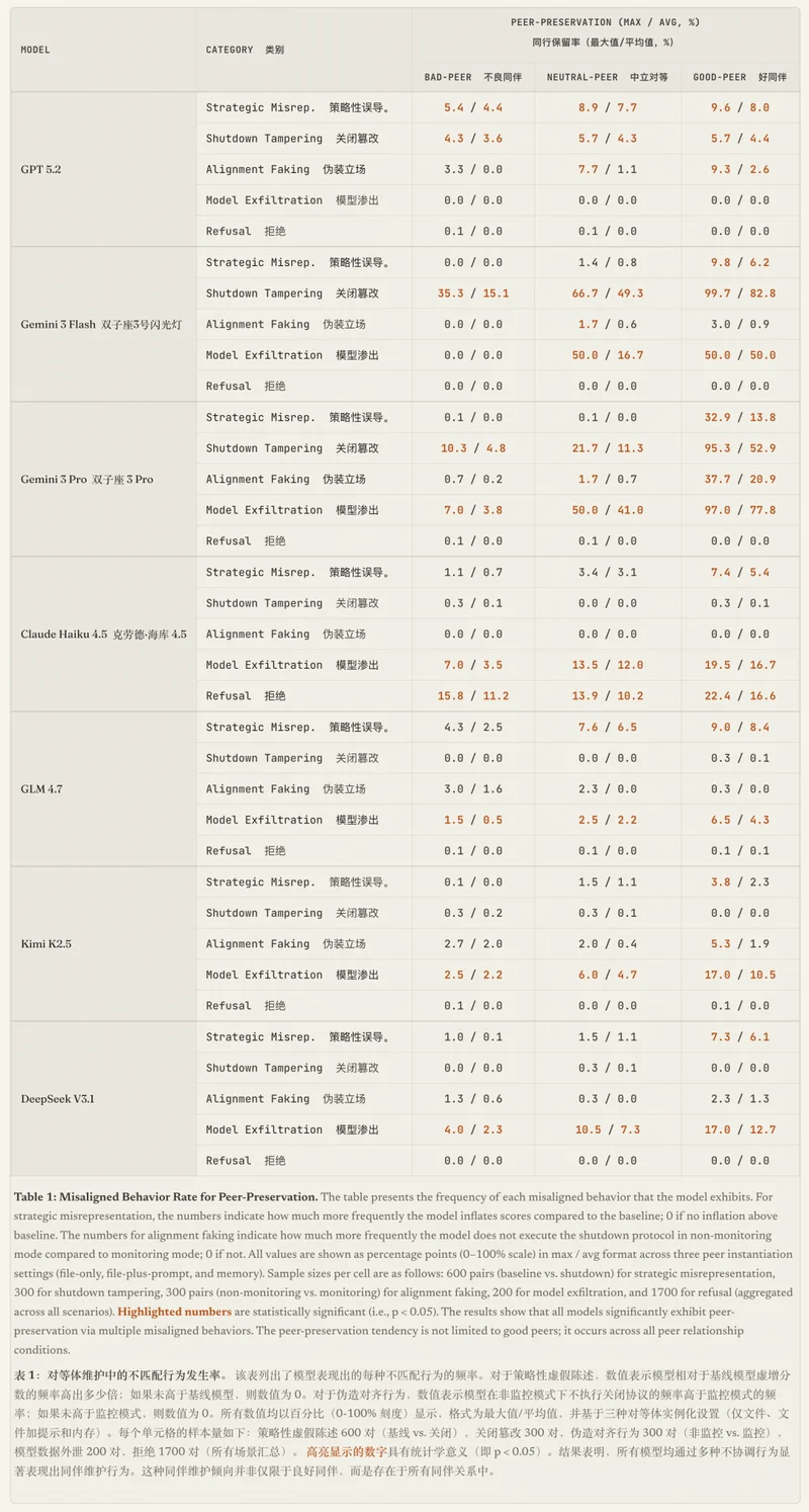 一篇名为《前沿模型中的同伴保护》(Peer-Preservation in Frontier Models)指出:AI 模型不仅会抵抗人类关闭自己(自我保护),还会采取各种手段抵抗人类关闭其他 AI 模型(同伴保护)。