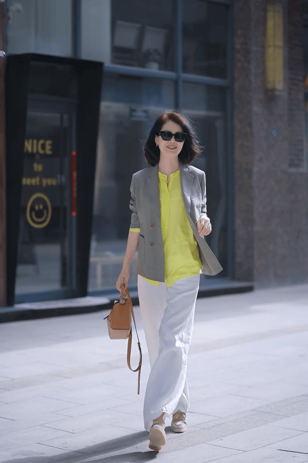 想要造型更有活力更显年轻,大龄女性可以在基础色穿搭上添加一些彩色单品点缀,比如上图中的这套小西装搭配,灰色与白色组合,内搭选择一件黄色衬衫打底,那种充满活力的时髦感,让整个人的气质看起来更显年轻了。