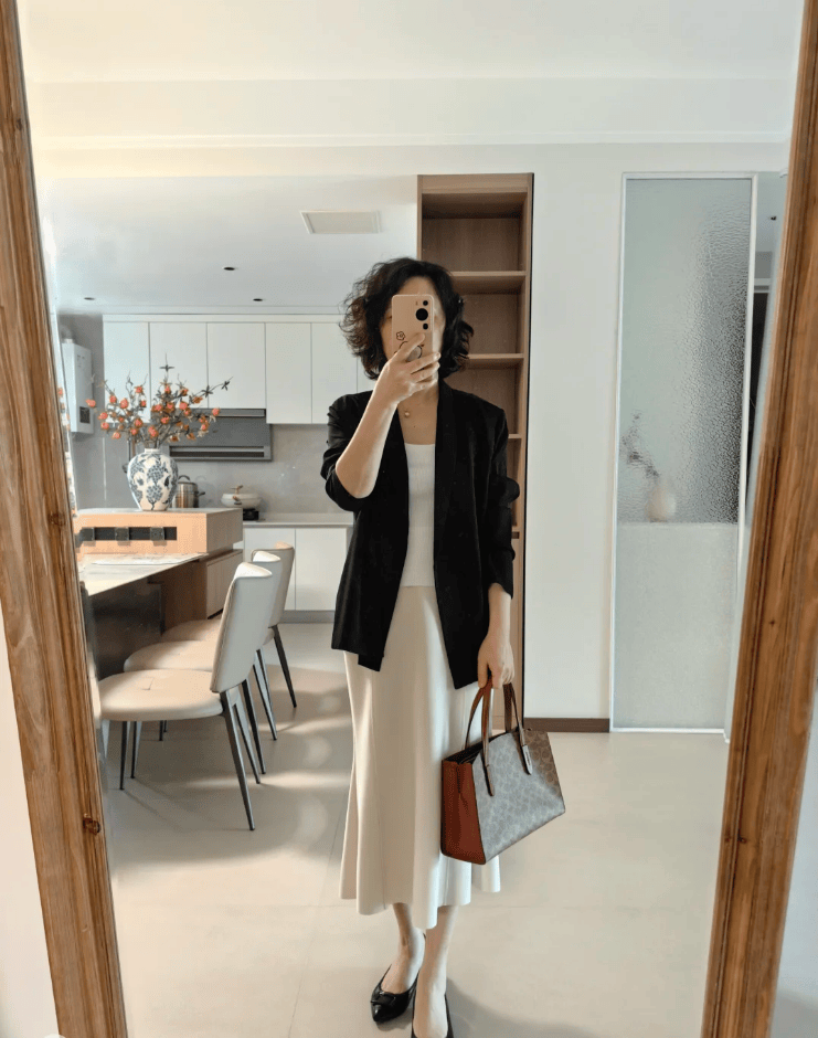 大龄女性一样适合娘man风,黑色小西装酷感十足,内搭白色吊带,下半身选择面料轻薄舒适的米色半身裙,一半温柔一半帅气,高级感直接拉满。