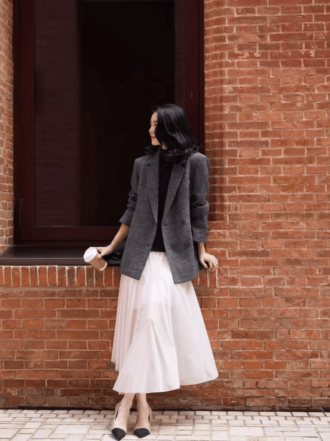 而对于微胖的大龄女性来说,宽松的大廓形西装才是首选,这样可以给身材留有余量,内搭在选择贴身版型的打底衫或者T恤,配合高腰半身裙,帅气与温柔结合,对于50+女性,可以选择纯色廓形西装配碎花半身裙,简繁结合,更显年轻哦!