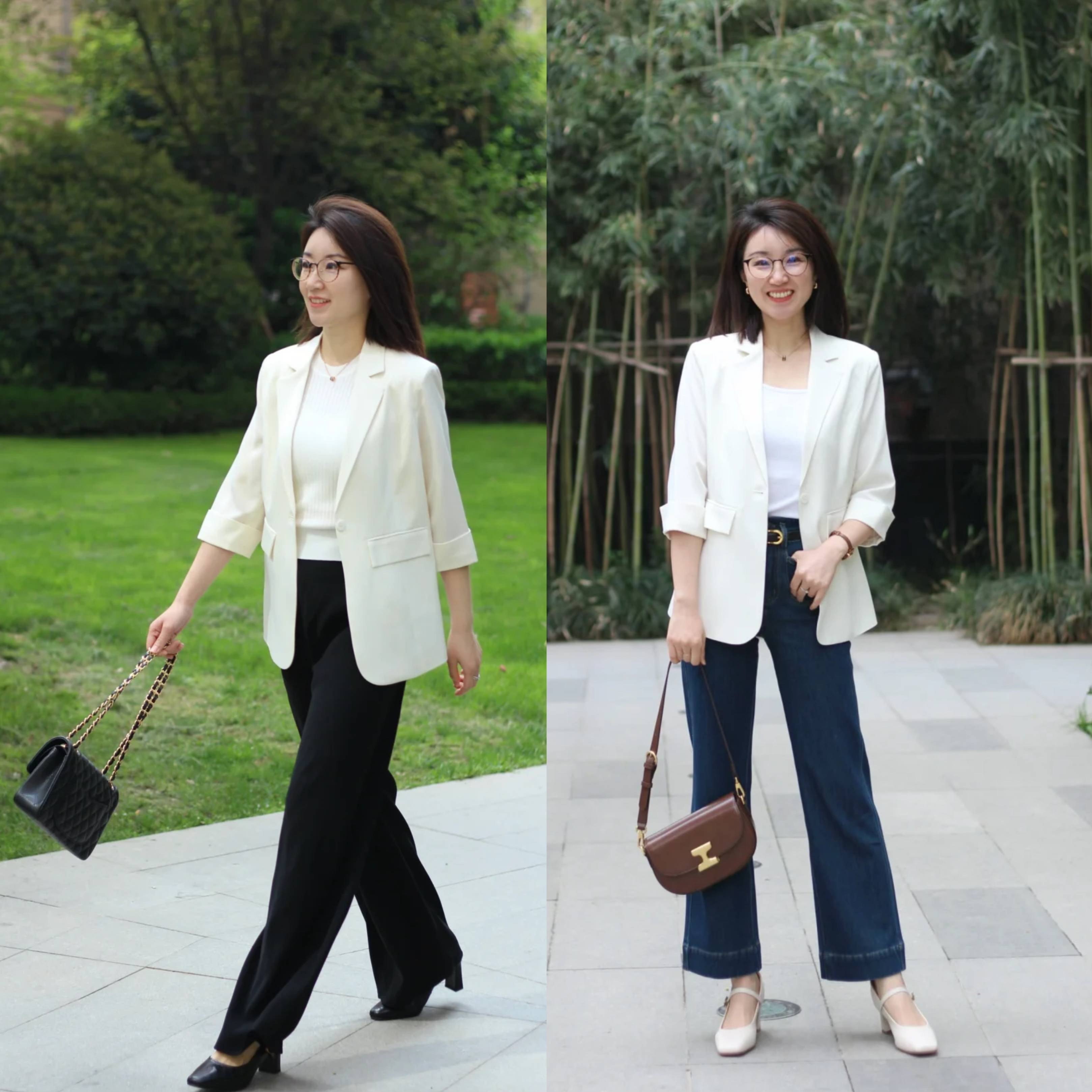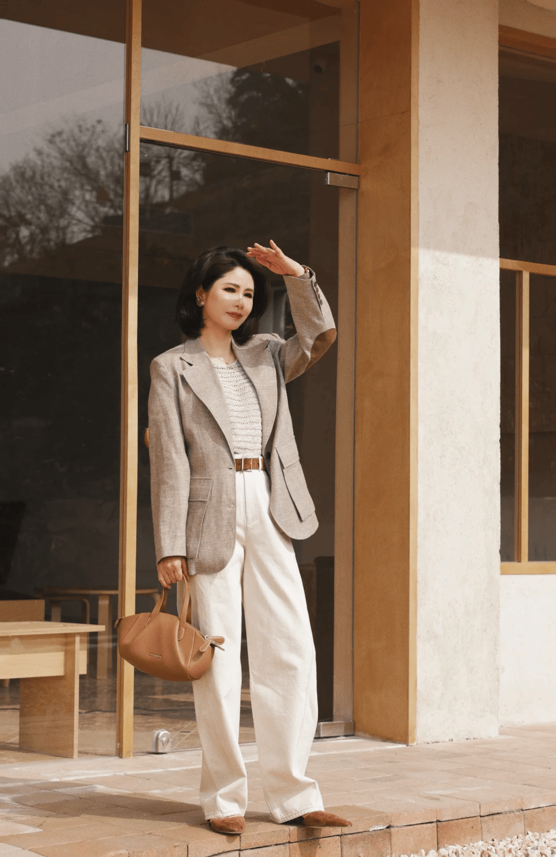 再来看看松弛感的小西装搭配,浅灰色亚麻小西装内搭白色T恤,下半身选择蓝色牛仔阔腿裤,推荐选择面料轻薄的牛仔裤更有飘逸感。