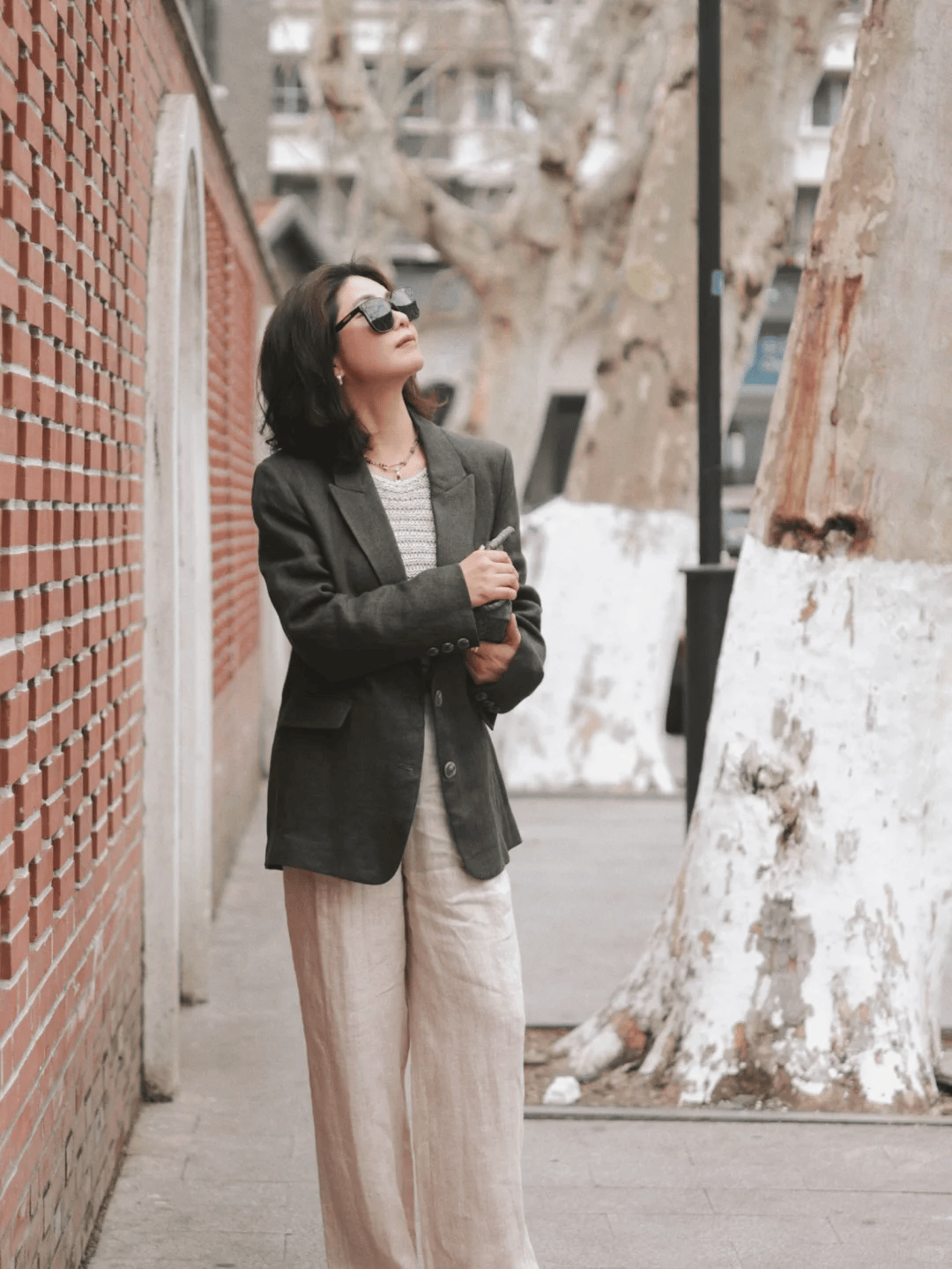 春季气温舒适,一天必一天暖和,西装的面料选择,可以尝试一下舒适透气的亚麻面料,军绿色小西装内搭浅灰色条纹衫打底,下半身用一条浅灰色亚麻阔腿裤组合,轻松打造慵懒的法式风穿搭,春日氛围感直接拉满。