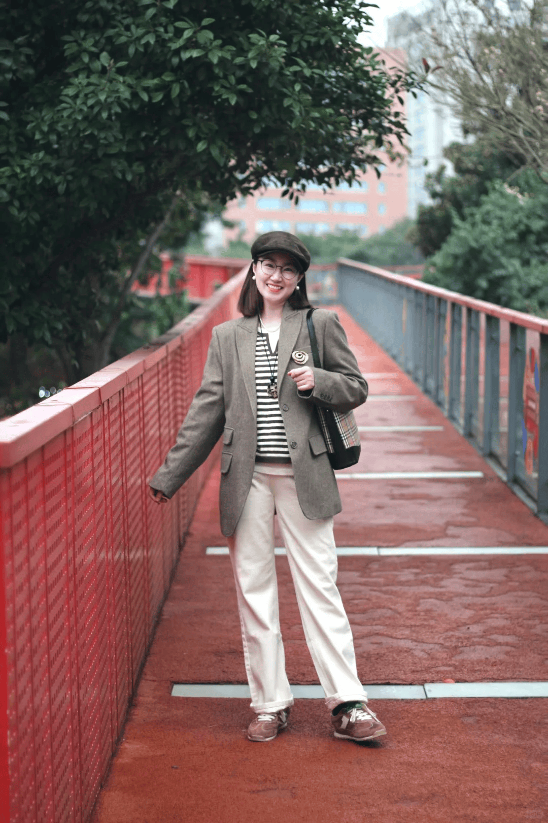 灰色廓形西装,内搭黑白条纹针织衫,下半身选择米色直筒休闲裤,咖啡色运动鞋,简约的基础色穿搭是经典不出错的,西装之所以百搭,在于它的包容性,基本上只要色彩搭配没有什么问题,大部分基础款都可以组合你想要的任何造型。