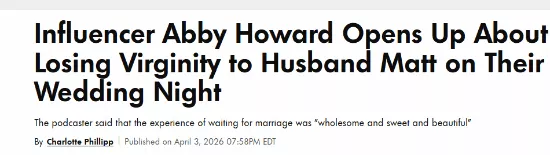 艾比与丈夫马特于2019年结婚,当时他们分别是20岁和21岁。艾比回忆,等到新婚之夜的过程“非常、非常纯洁、甜蜜而美好”。“到了那一刻,当然会对新事物感到兴奋,但不会特别紧张,因为那是你爱的人,……这带来了很多安心感,而不是随随便便的一夜情。你们之间有太多过往和感情,你知道对方只是为了与你亲密。”