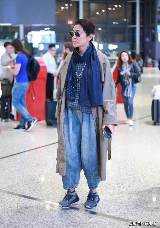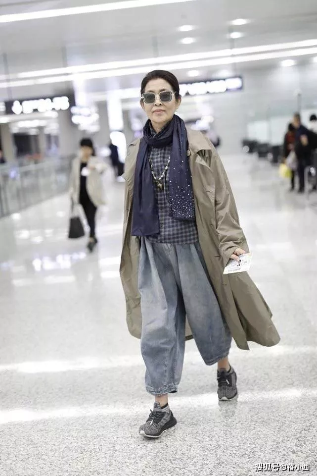 下装搭配了水洗蓝阔腿牛仔裤,垂坠感满分,完美修饰了她的腿型,搭配舒适的运动鞋,既兼顾了出行的自在,又不失时尚感,墨镜一戴,整个人的气场直接拉满,完全看不出岁月的痕迹。