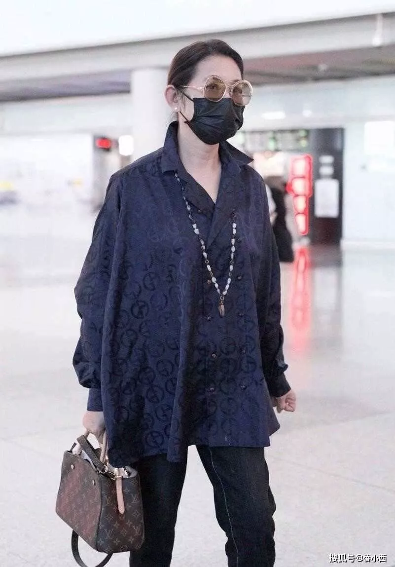 这一身藏青色衬衫造型,更是把“贵气感”玩明白了,上半身穿着宽松的暗纹衬衫,版型不挑身材,对中老年女性的身形极度友好,双排扣设计增添了精致感,下装搭配卷边牛仔裤,休闲又利落,LV手提包和长串项链作为点缀,更是在低调中透着品味。