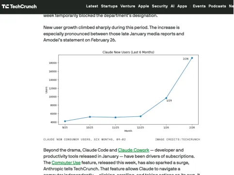 除了那些争议事件(超级碗投广告暗讽OpenAI、和战争部产生矛盾等等),今年一月发布的开发者和效率工具Claude Code和Claude Cowork一直是订阅用户增长的主要驱动力。