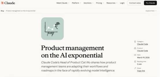 3月19日,Claude官方博客刊出了Cat Wu署名的文章《AI指数级进化下的产品管理(Product management on the AI exponential)》,她的头衔是“Claude Code产品负责人”。