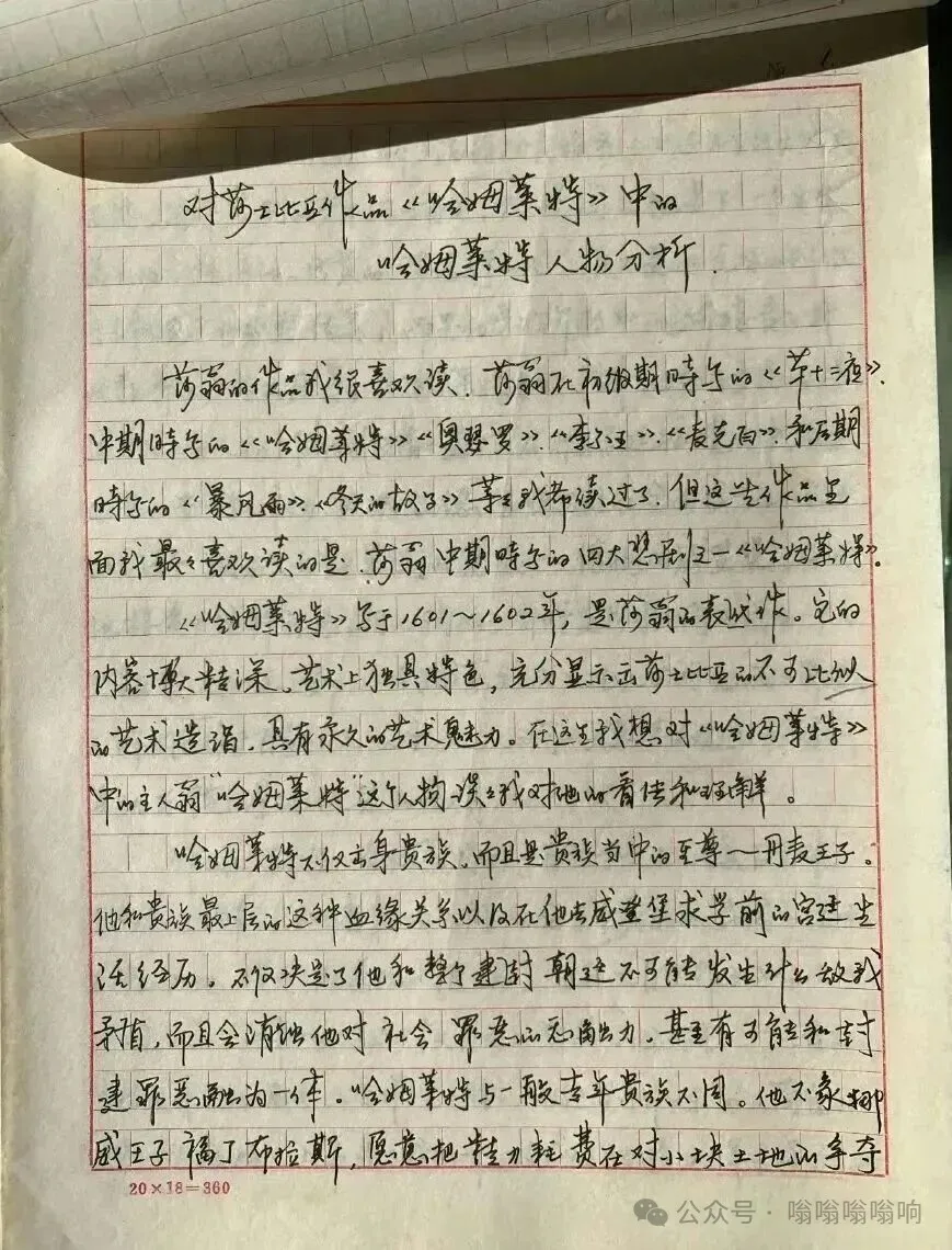 中哈姆莱特的人物分析》作业中可以看到她对莎士比亚剧中人物的艺术见解,还有她的的文字书写功底 ,特别是他的硬笔书法 给人们留下 较深的印象 。