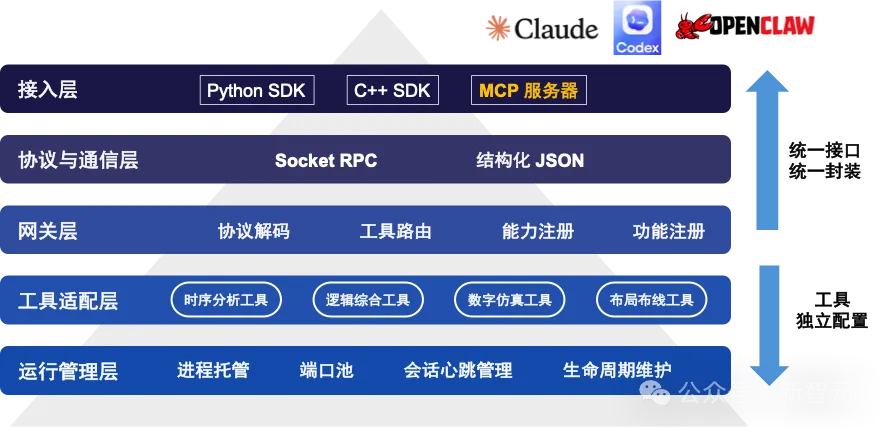 FluxEDA并不是简单「包一层 API」。它打通了从TCL gateway、Socket RPC 协议、Python/C++ SDK、CLI 到MCP Server的完整链路,将散落在不同 shell 中的工具能力整理成结构化、可注册、可调用的原子 API,让上层 Agent可以通过统一的api_*接口持续驱动真实工具流程。