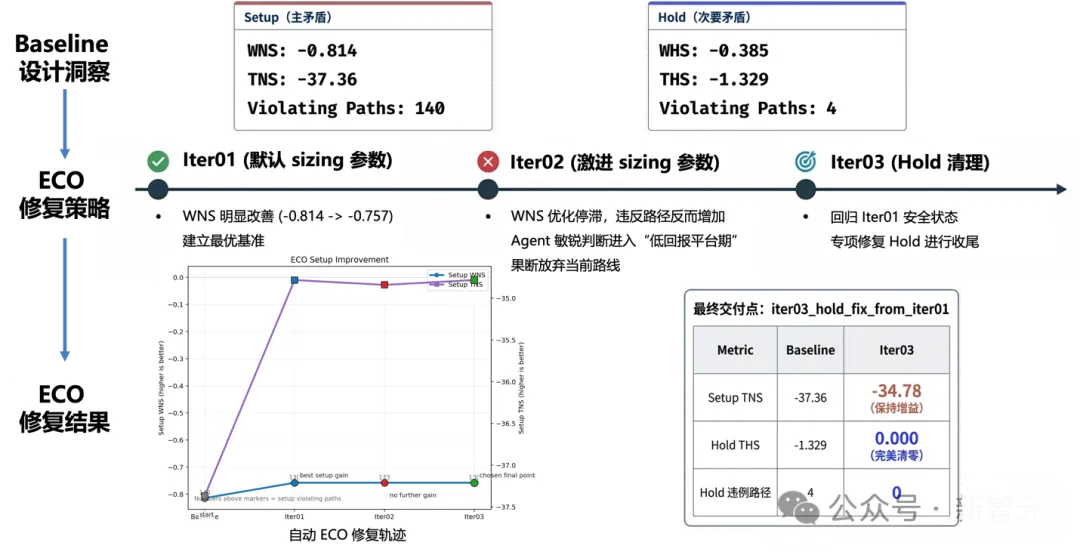 关键在于,Agent并不是盲目堆单元、机械试错。它能够读取PrimeTime关键路径报告,并基于路径结构识别设计中的关键薄弱点,例如前端驱动偏弱、局部闭合能力不足以及部分低频单元冗余,再据此做有针对性的补强与剪枝。