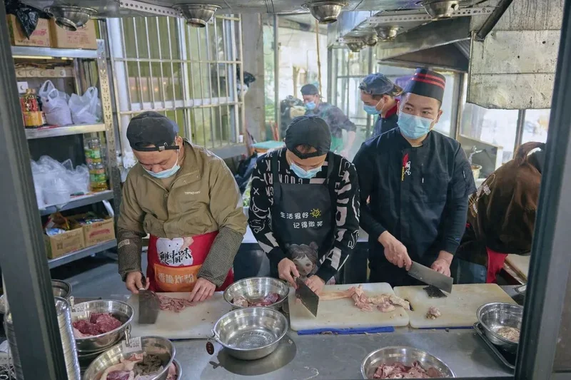 七哥开宾利来实属“不得已”,他打开SUV的后备箱,在河池买的几个泡沫箱装着新鲜牛肉和鱼,已经没多少空间再装我们的行李了。“现在天凉了,中午吃炒牛杂热闹一点,晚上我们喜欢打火锅。”七哥拉着我们直接去他的“七兄哥”排档店里,原本以为他只是一个财大气粗的美食爱好者,没想到他自己开了小小的餐厅,做菜比专职的厨师还要拿手。他一进店,厨师们就围过来看他带回的好货。“河池那边中午刚宰好的牛。”他掏出牛脸、百叶、小肠和其他内脏,还有牛腩、吊龙和前后腿肉等。这天他叫了几位朋友相聚。来之前大家只知道今天有新鲜的牛料,没想到看见他穿着皮衣和白裤子正在厨房里亲自操刀:“今天七哥下厨啊,有口福了。”