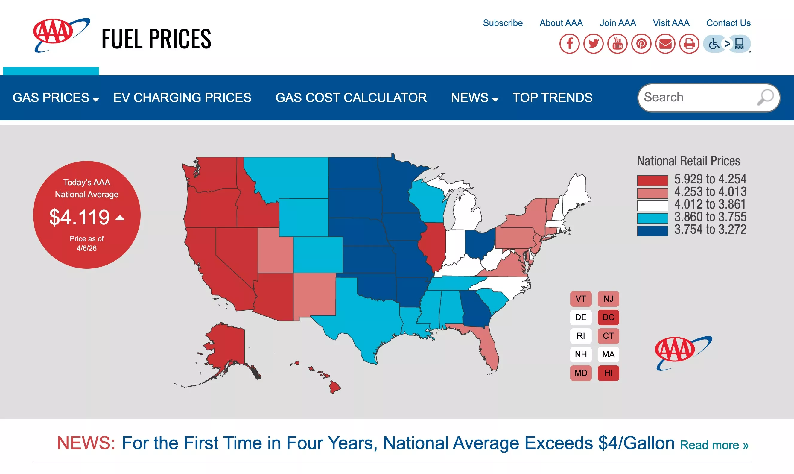 美国平均汽油价格四年来首次突破4美元一加仑。(AAA网站截图)