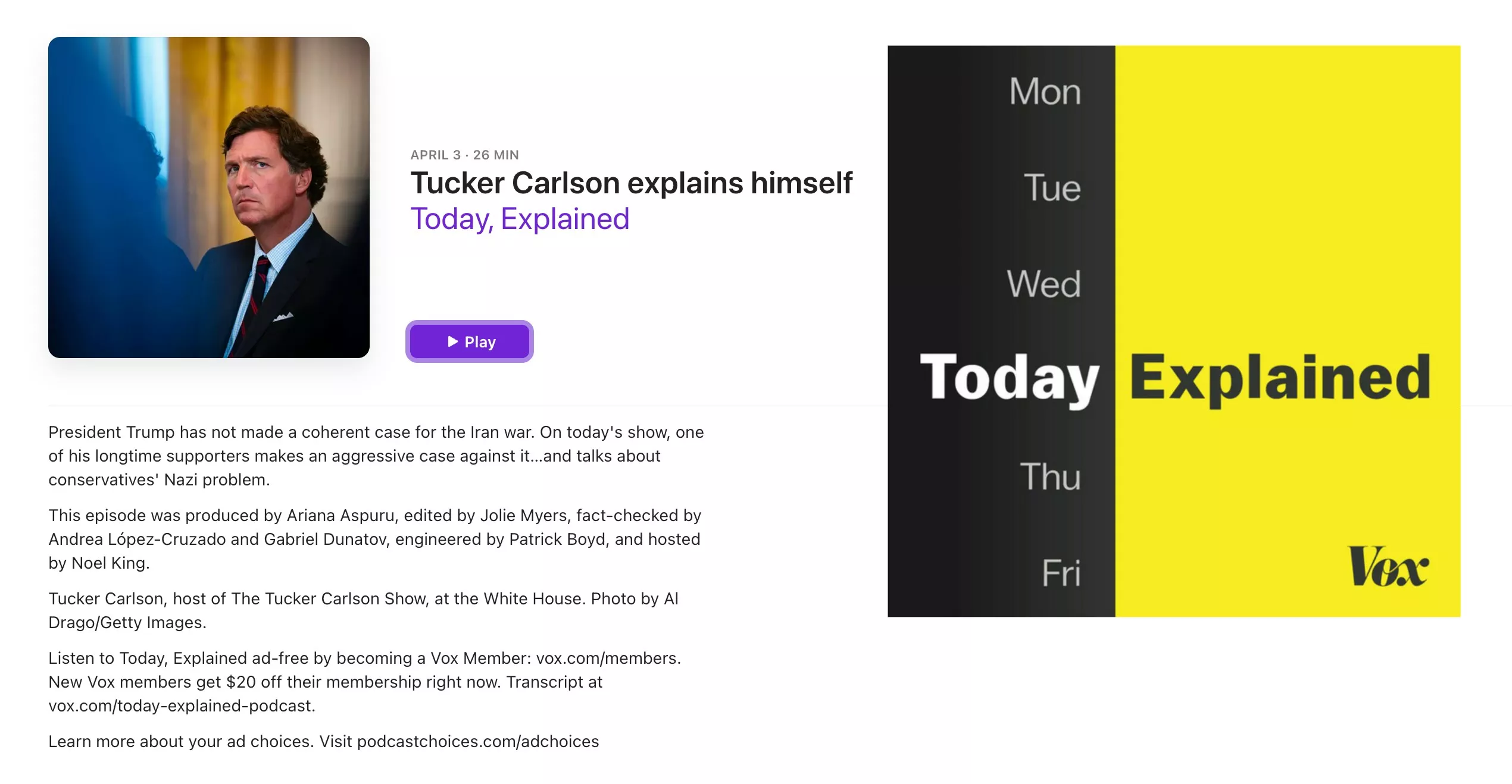 福克斯新闻台(Fox News)前主播卡尔森(Tucker Carlson)登上Vox王牌节目《Today Explained》作为受访嘉宾。(网上截图)