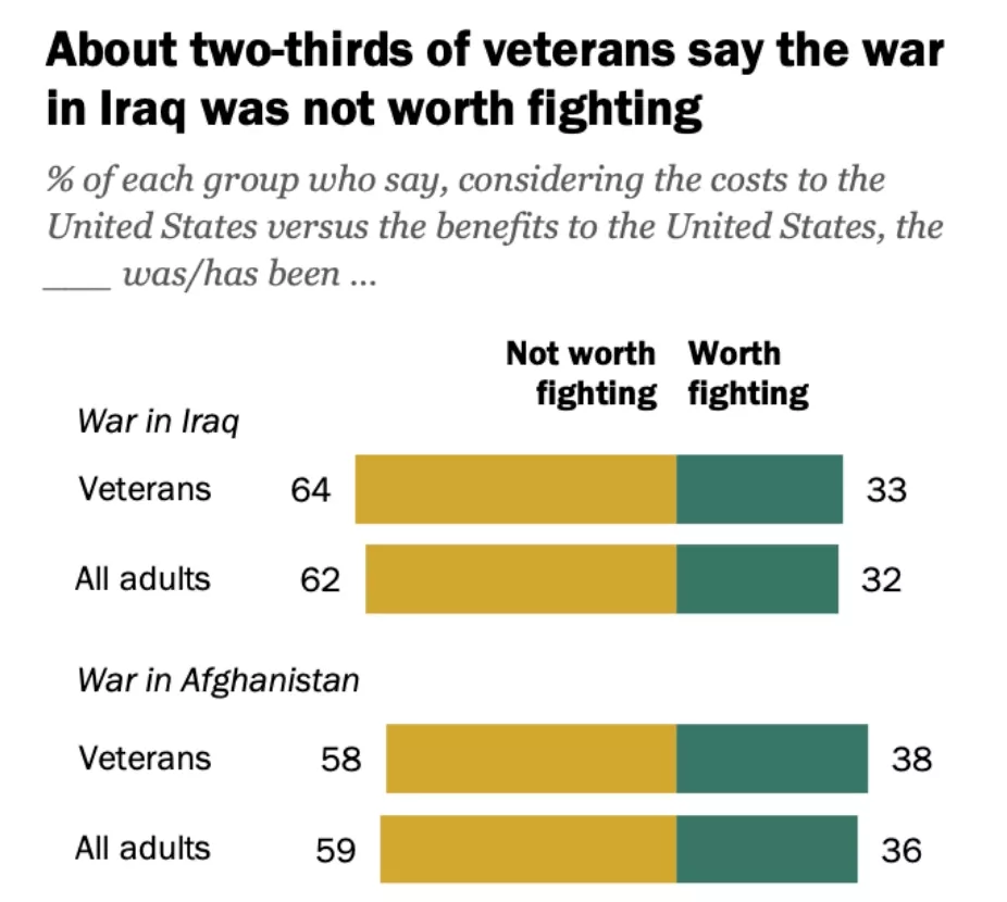 根据2019年的皮尤研究中心(Pew Research Center)民调,62%美国成人认为伊拉克战争不值得打,持相反意见的只有32%,而对于9-11恐袭时确实匿藏阿尔盖达的阿富汗,此数则为59%对36%。(Pew)