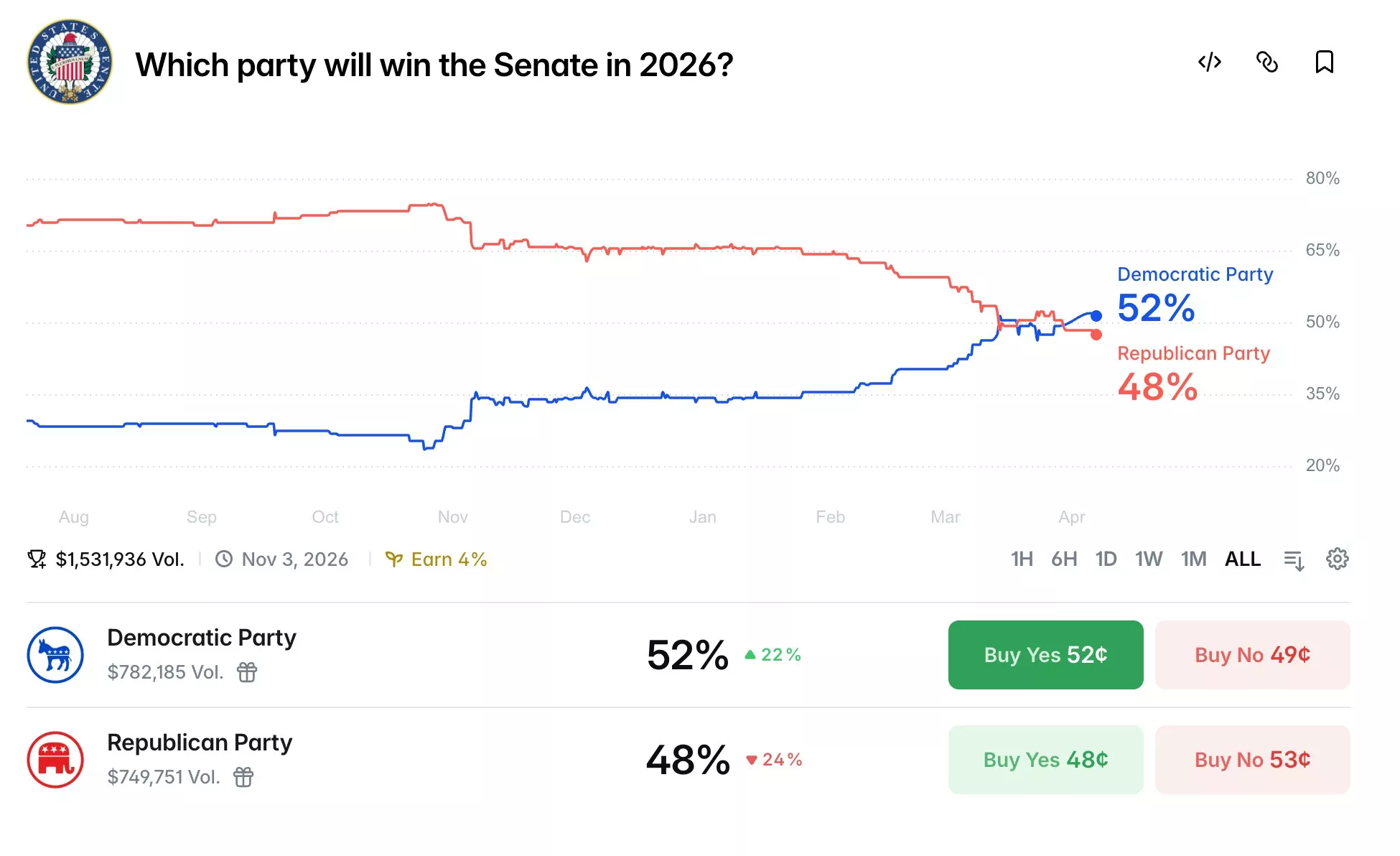Polymarket上的2026年国会参议院赌盘(网站截图)