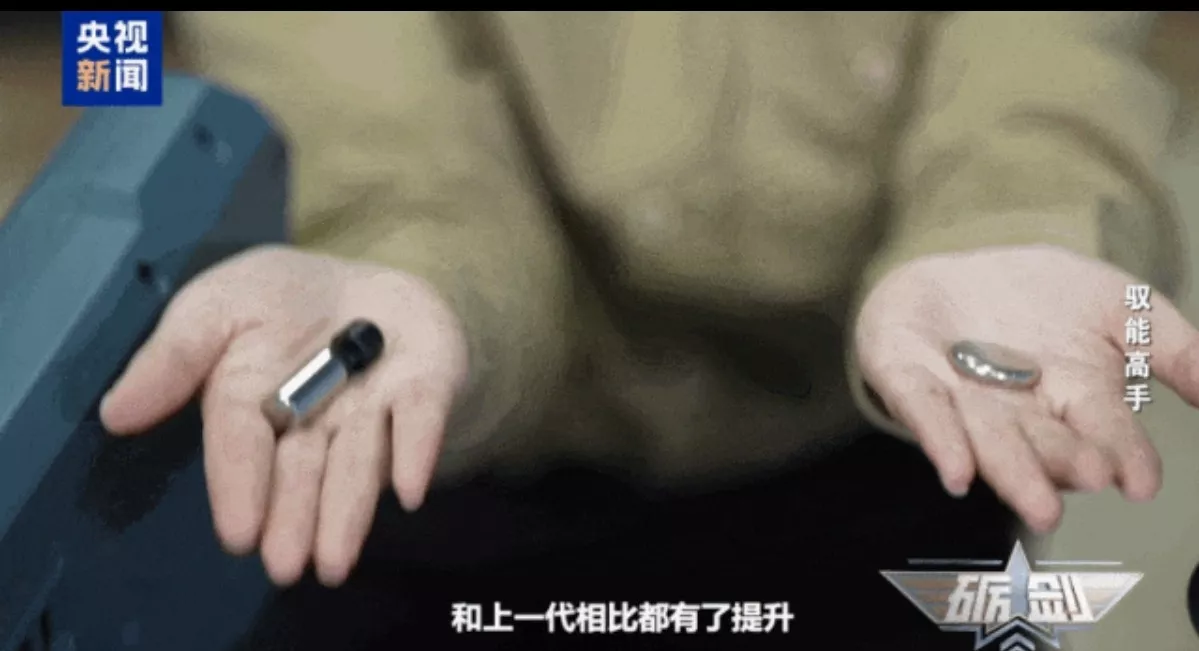 最新一代电磁发射器的弹丸(左),它的体积、重量和上一代相比都有了提升,也就说明它的动能和威力都加大了。