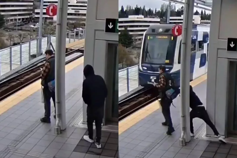 美国西雅图日前险些发生夺命落轨事件。一名男子在月台候车滑手机时,遭另一名26岁男子梅兰德斯(Elisio Melendez)从后方蓄意推向轨道,所幸受害者及时稳住平衡,与进站列车仅差数公分距离,惊险擦身而过。