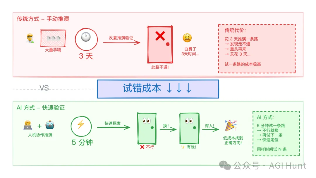 以前想测试一个「可能行得通也可能完全没戏」的数学思路,你得花好几天手动推演。而现在,让 AI 跑一下,几分钟就能知道值不值得继续。