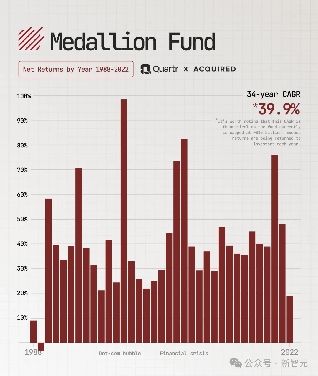 按公开数据,1988到2022年,34年复合年化增长率约39%,大奖章基金累计为投资者创造了超过9万倍的净回报。