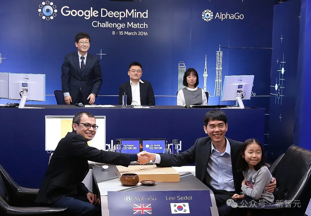 2016年3月9日,首尔四季酒店,Hassabis(左)与韩国围棋九段李世石赛前握手。几天后AlphaGo以4:1击败李世石,全球超过2亿人观看。这是AI首次在围棋上击败世界顶级人类棋手,也是Hassabis登上世界舞台的时刻。