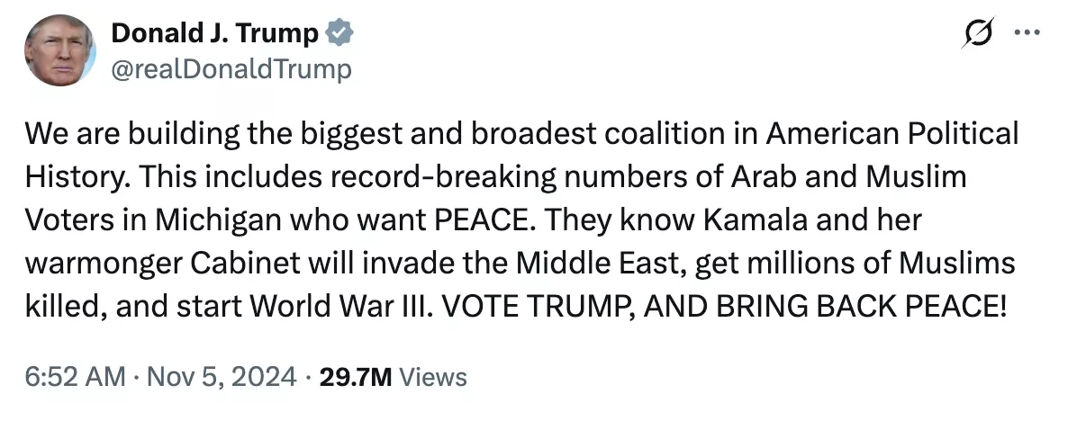 2024年,川普公开指责其对手贺锦丽(KamalaHarris)会引起第三次世界大战,声称贺锦丽将会“入侵中东,杀死数以百万计的穆斯林”。(X截图)