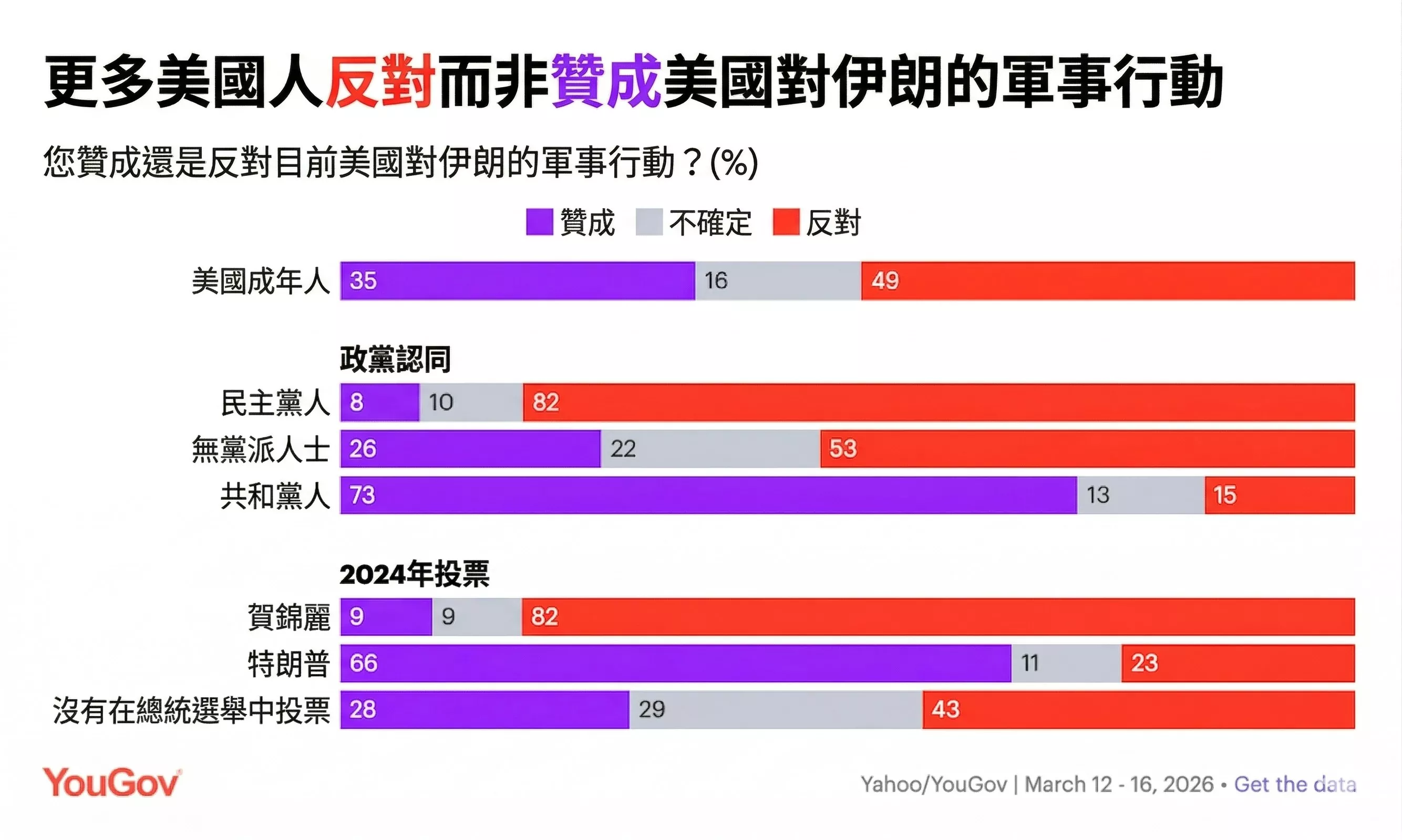 而根据YouGov民调,在2024年投票支持川普的选民当中,只得66%人支持美国发动伊朗战争。