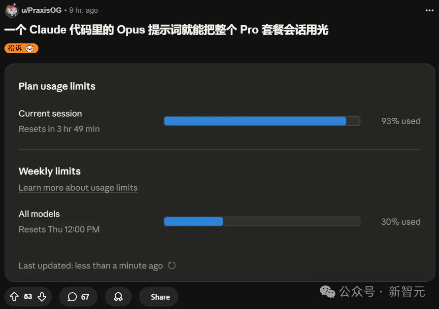 一个月付100美元Max x5套餐的用户表示,以前能用8小时的额度,现在1小时就烧完了。还有人才19分钟就把5小时的额度耗尽。