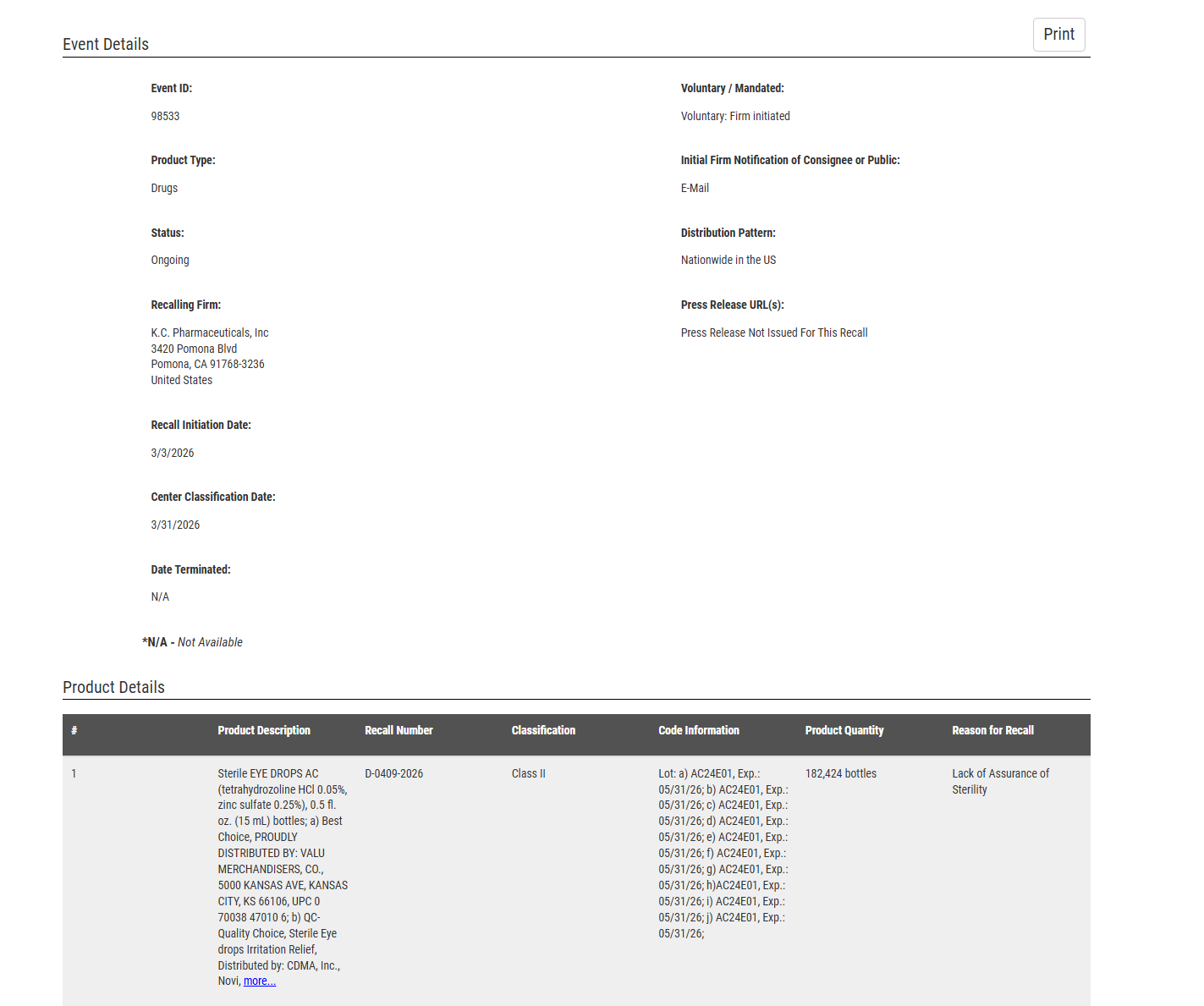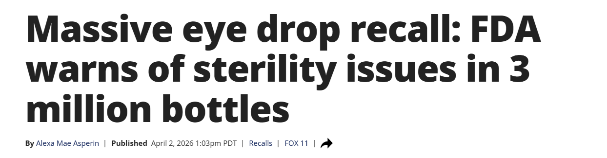 根据美国食品药品监督管理局(FDA)3月31日公布的信息,总部位于洛杉矶县波莫纳的K.C. Pharmaceuticals已主动召回约3,111,072瓶眼药水产品。