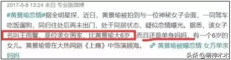 黄景瑜和张艺上在2017年因为合作《为了你我愿意热爱整个世界》认识,由于两人片场互动过于暧昧传出绯闻,比如黄景瑜让张艺上玩她的手,远超出了一般朋友关系。而后,狗仔卓伟爆料黄景瑜已婚,还拍到了他与单亲妈妈王雨馨同框约会的画面,而他与张艺上的绯闻在当时并未掀起波澜。