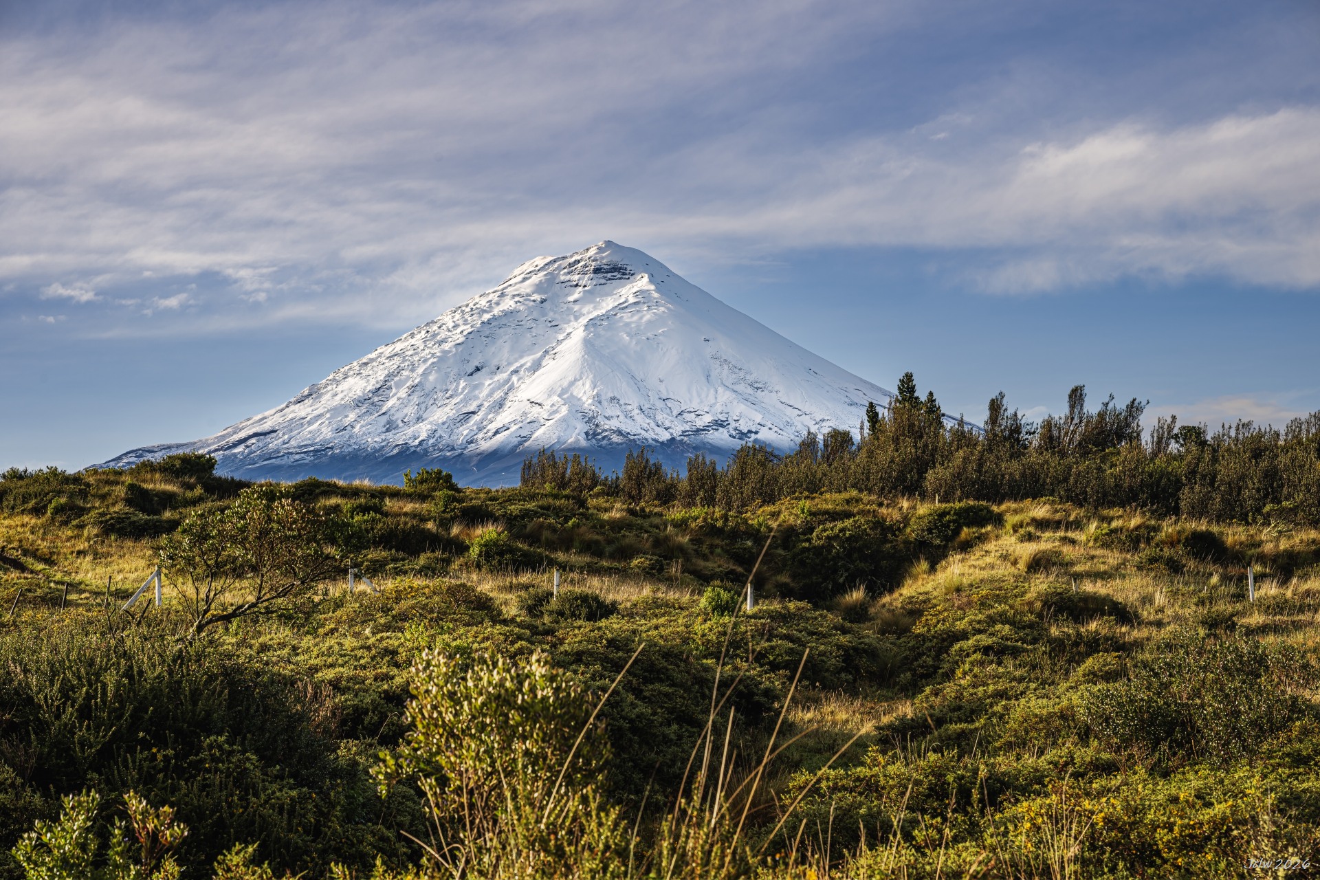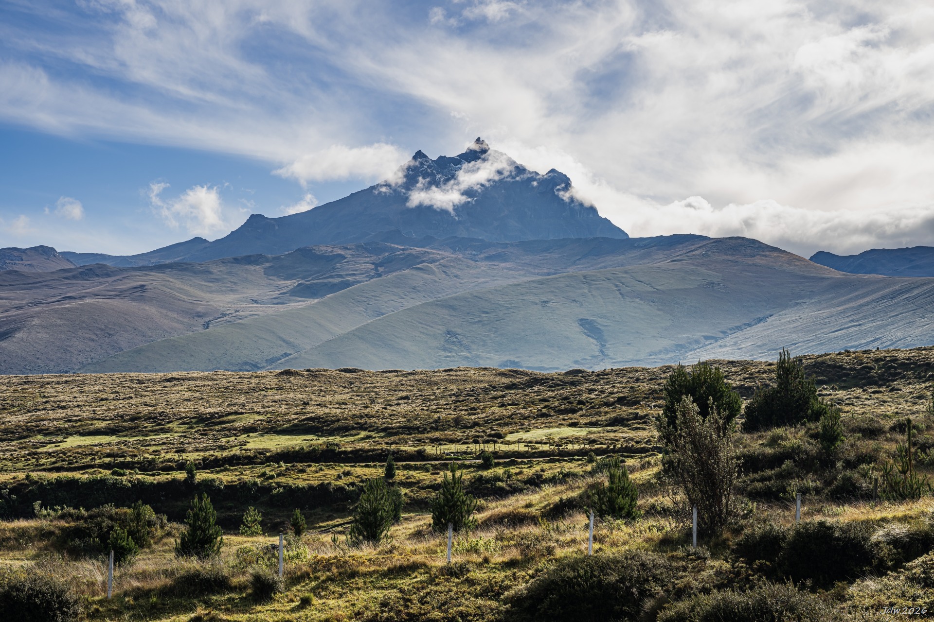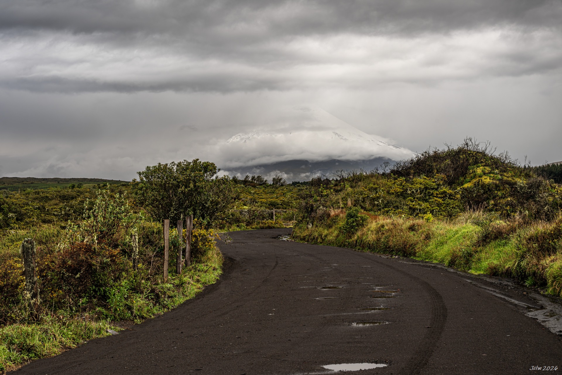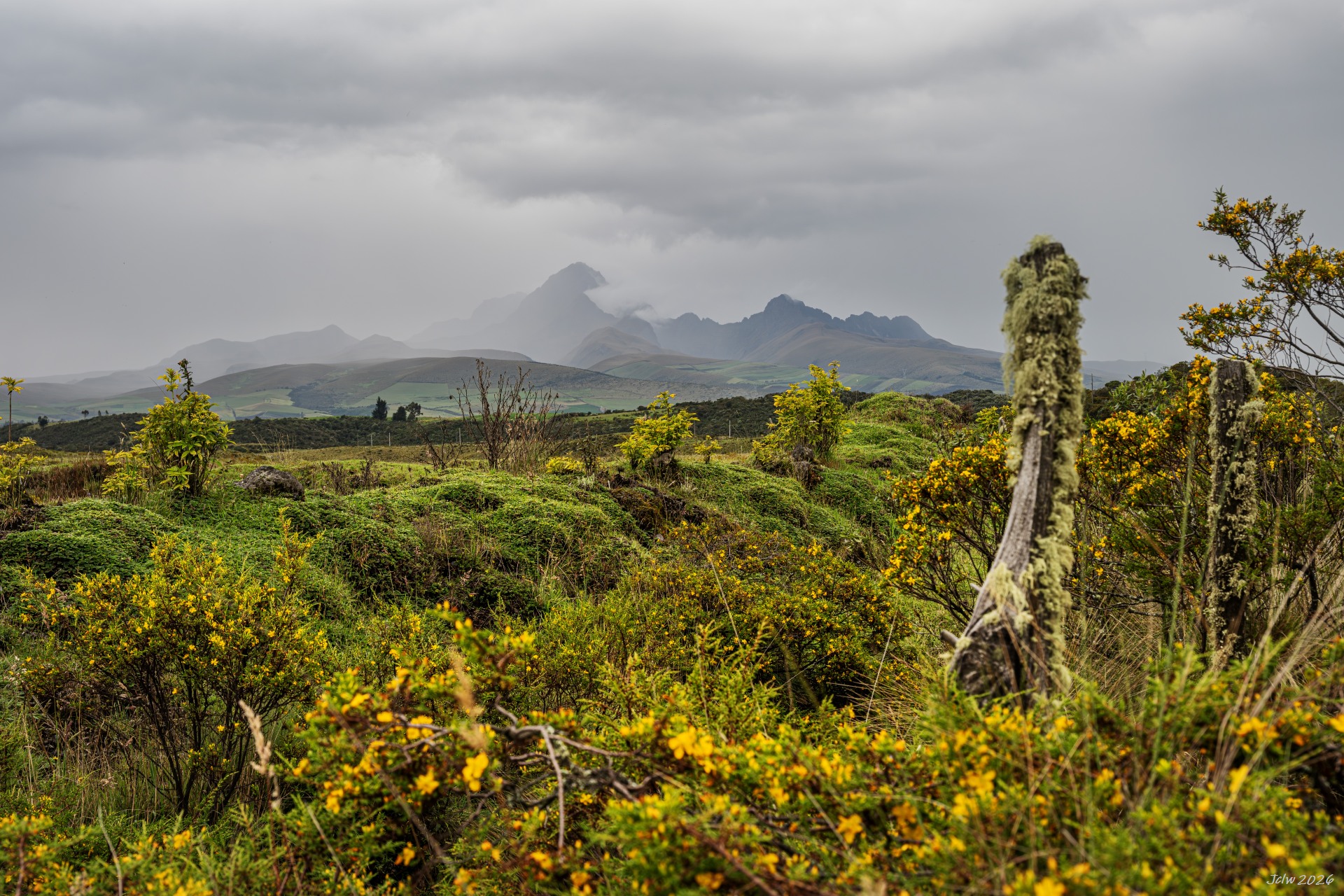 科托帕希国家公园(Parque Nacional Cotopaxi/Cotopaxi National Park)距基多(Quito)约50公里,天气好的时候从基多能清楚地看见。 公园的主角是科托帕希火山,其顶峰的海拔为5897米,终年积雪。 这里除了观雪山,爬山外,也是观赏野生动物的好地方。我们这次预定了位于北门外的旅馆Hotel Hacienda Los Mortiños, 希望在傍晚看见照在雪山上的最后一缕观光和次日壮丽的日出。 我们是午后从基多出发的,因为旅馆在公园北门附近,去的时候谷歌地图就引我们走北边的道路,从Machachi离开E35公里后不久,一路上都是烂路石子路, 到处都是坑,而且一路伴随者雨,汽车的时速很难达到30公里。 不过一路上风景不错, 从绿油油的牧场,逐渐变成苔原和高山草甸。 接近公园的时候, 偶尔透过雨雾的缝隙隐隐约约地看见远处的科托帕希时心里非常激动。