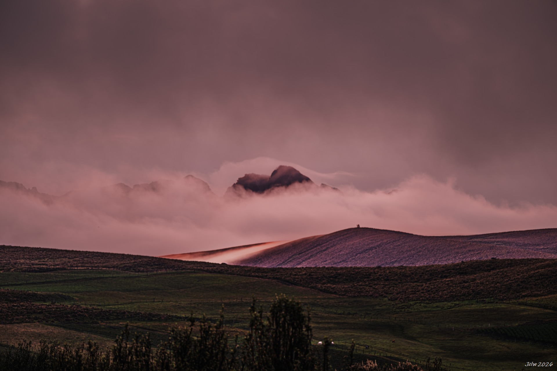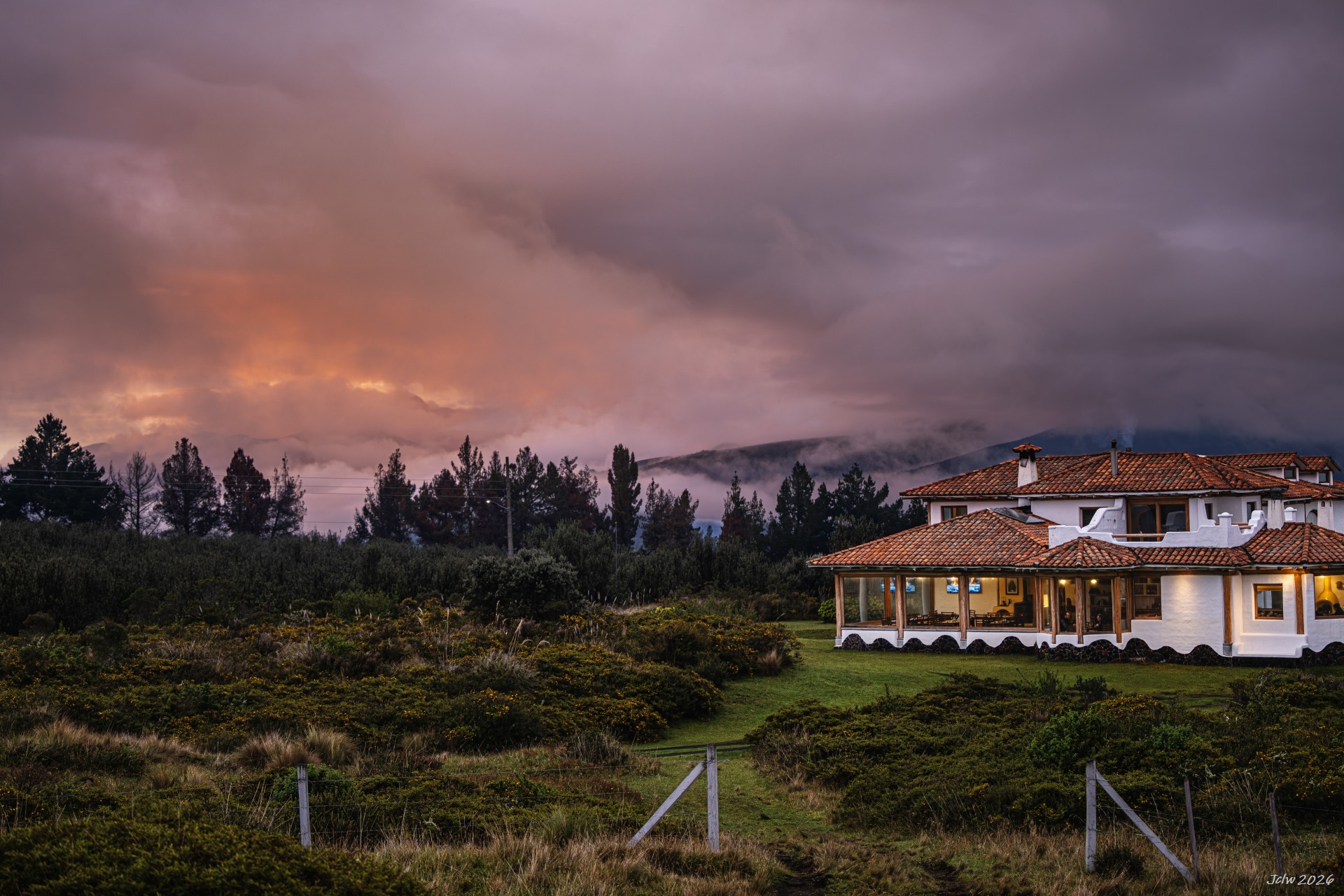 最后终于到达了旅馆,接待人员给我们每人做了一杯热乎乎的茶,几个小时的颠簸终于熬到头了。大概因为是旅游淡季,入住旅馆热客人很少,我们是当日入住的第二家客人,当晚住宿的客人也就4家左右。 这个旅馆应该是这一带档次很高的一个,距离公园的北门不到2公里,看科托帕希火山可谓是一览无余。当天下午一直都在下雨,我们也只能在客房里或旅馆的餐厅里打发时间,第二天能不能看见山是个未知数。 我们的房间就对着科托帕希火山,第二天早上不用出门,打开窗帘就能知道能不能看见雪山。 第二天凌晨闹钟响后,打开窗帘,果然天气晴朗,科托帕希火山在黑暗中轮廓分明,今天有日照金山了。
