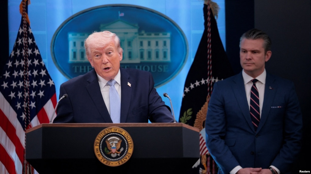 2026年4月6日,特朗普总统在战争部长海格塞斯和其他美国官员的陪同下举行记者会介绍了美军在周末营救身陷伊朗腹地的F-15E战机机组人员的过程。