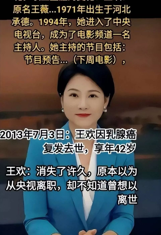 这个声音的主人叫王欢,她是电影频道最早的女主播,和朱军搭档过,在台前笑盈盈的,谁也想不到,她42岁就因癌症走了,到今年刚好12年。
