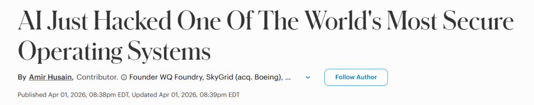 4 月 1 日,《福布斯》(Forbes)杂志刊发了一篇由人工智能专家阿米尔・侯赛因(Amir Husain)撰写的专栏文章,题目很直白:《人工智能刚刚攻破了世界上最安全的操作系统之一》。
