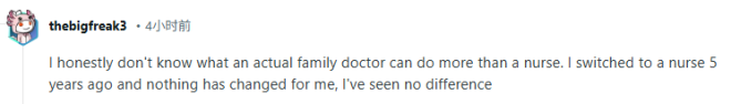“说实话,我真的不知道家庭医生能比执业护士多做什么。我5年前就改看执业护士了,对我来说几乎没有任何变化,也没有感受到什么区别。”