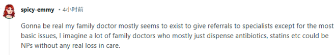 支持者表示:“说实话,我的家庭医生大多数时候好像只是负责把我转诊给专科医生,除了一些最基本的问题之外。我觉得,很多主要就是开抗生素、他汀之类药物的家庭医生,其实完全可以由执业护士来替代,而不会对医疗质量造成什么实际影响。”