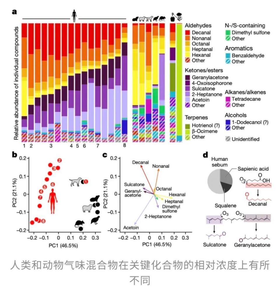 换句话说,蚊子并不是在空中“闻到了血”,而更像是在辨认你皮肤表面那张独特的“气味身份证”。2023年《Current Biology》在更接近自然夜间环境的半野外实验中,也得出了高度一致的结论:当蚊子面对不同人的整身体味时,会明显偏好某些人,而高吸引力个体的气味中,丁酸、异丁酸、异戊酸以及由皮肤微生物参与生成的乙偶姻等成分相对更丰富。这也是为什么“汗味重的人更招蚊子”这句民间经验只说对了一半:严格地说,关键并不是汗液刚分泌出来的那一刻,而是汗液、皮脂与皮肤微生物共同加工后,生成了哪些挥发性分子[1][2][5]。