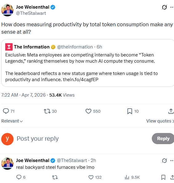 彭博旗下媒体人Joe Weisenthal在X平台上直接发问:"用token总消耗量来衡量生产力,这到底有什么意义?"