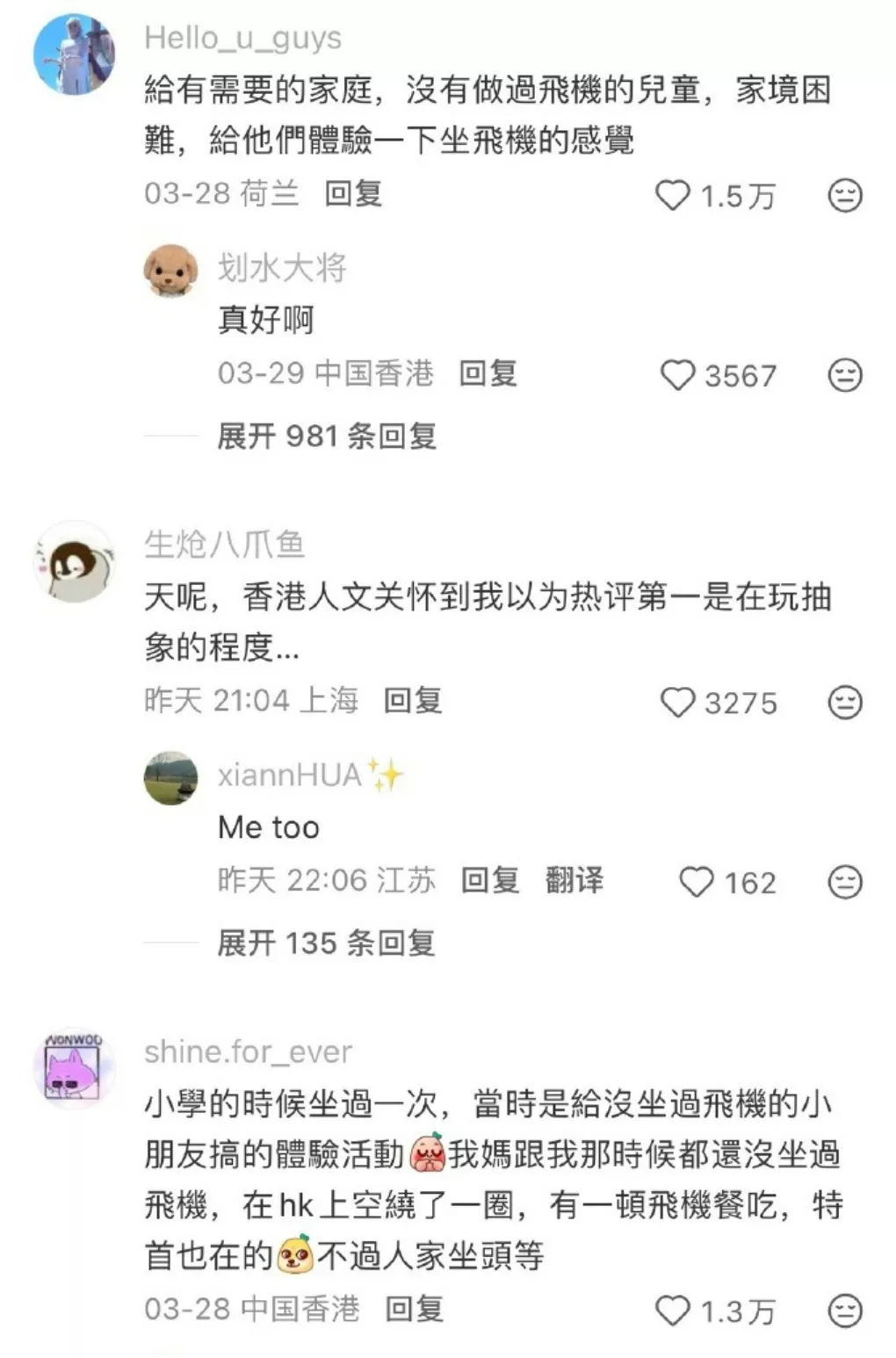 微博热帖评论区内,网民大赞香港“真正的文明社会,人文关怀!”还有人表示,“这种安排真的很温暖”,“不需要有特定的目的地,只为了体验一把,这还是很值得的”。有网民感叹,“不是每个人都有机会搭飞机,这对孩子来说可能是一辈子的回忆”。
